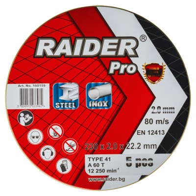 Ο τροχός κοπής RAIDER A60T 2302.022.2mm είναι ιδανικός για κοπή ανοξείδωτου χάλυβα (INOX), προσφέροντας ακριβή και ανθεκτική κοπή χωρίς κίνδυνο διάβρωσης ή αποχρωματισμού του υλικού. Σχεδιασμένος για υψηλή αντοχή και ανθεκτικότητα, αυτός ο δίσκος παρέχεται σε πρακτικό μεταλλικό κουτί που περιέχει 5 δίσκους, προστατεύοντάς τους από εξωτερικές φθορές και εξασφαλίζοντας εύκολη αποθήκευση και μεταφορά.