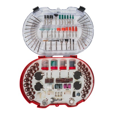 Περιλαμβάνει λειαντικές πέτρες και δίσκους λείανσης για διαμόρφωση και φινίρισμα επιφανειών, μύτες χαρακτικής για λεπτομερείς εφαρμογές σε ξύλο, μέταλλο και γυαλί, δίσκους κοπής για μέταλλο, ξύλο και πλαστικό για ακριβή κοπή, τροχούς στίλβωσης για φινίρισμα και λάμψη, συρμάτινες βούρτσες για αποτελεσματικό καθαρισμό επιφανειών και ιμάντες λείανσης σε διάφορα μεγέθη και κόκκους για μεγαλύτερη ευελιξία. Το σύνολο είναι άριστα οργανωμένο σε μία κασετίνα διευκολύνοντας τη χρήση και αποθήκευση.