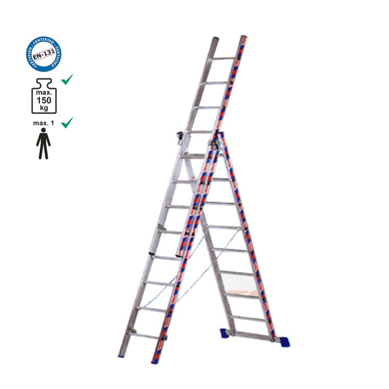 Η τριπλή επαγγελματική σκάλα αλουμινίου είναι κατάλληλη για οικιακή, ιδιωτική και επαγγελματική χρήση σε εσωτερικούς χώρους. Με 21 σκαλιά συνολικά, παρέχει αξιόπιστη σταθερότητα και ασφάλεια κατά τη χρήση. Οι ιμάντες συγκράτησης των τεμαχίων σε μορφή Λ διευκολύνουν τη μεταφορά και αποθήκευση. Η βάση-πέλμα διαθέτει αντιολισθητικά πατάκια για επιπλέον ευστάθεια.